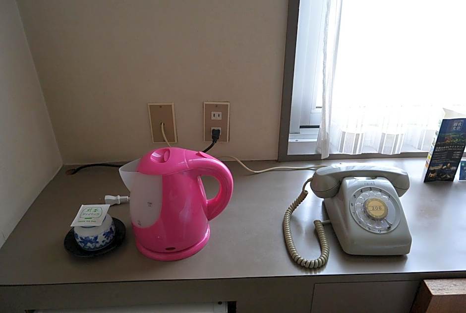 Simple heated room with a fridge, an electric kettle with green tea, and a yukata robe. Toiletries are provided.
